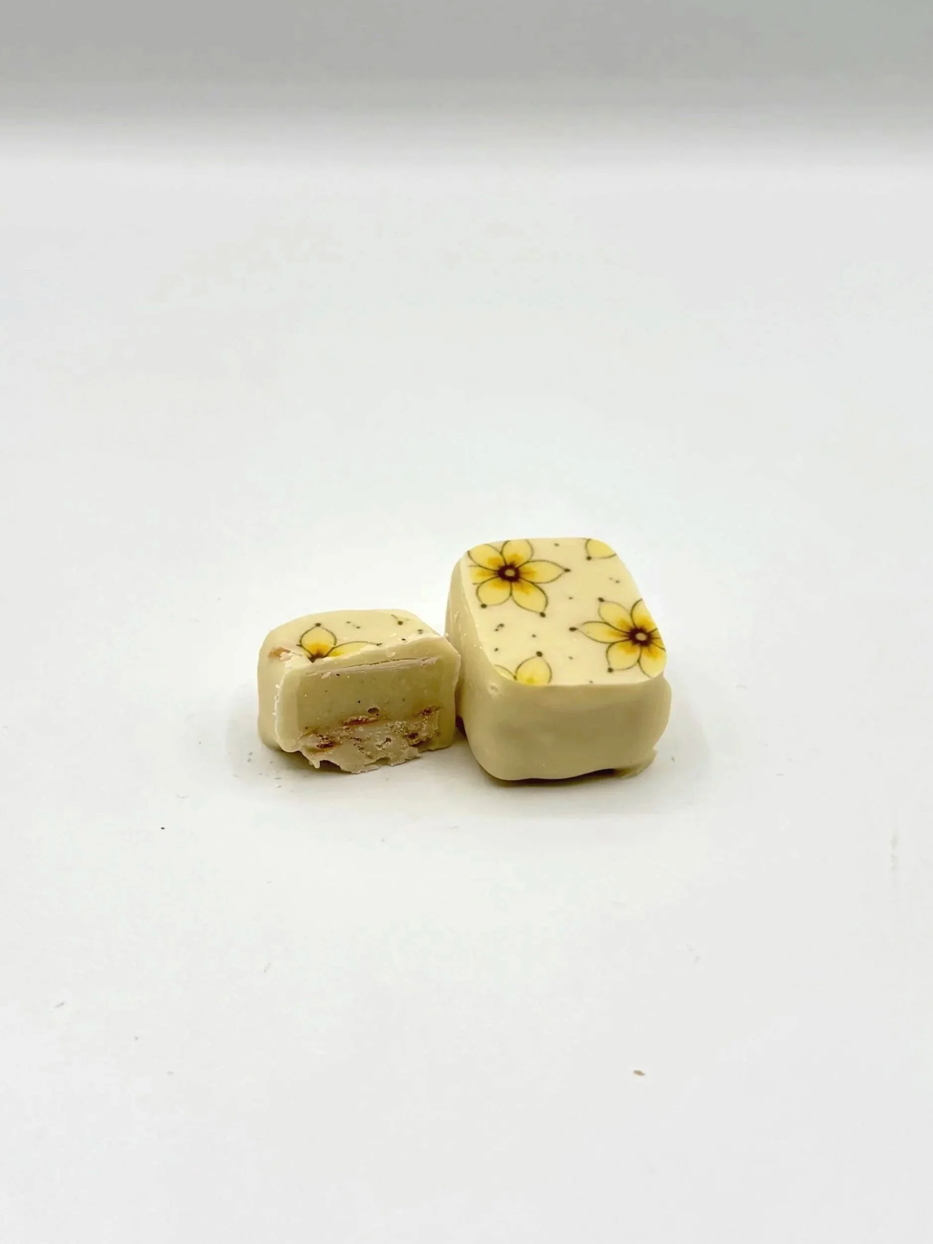 De vanille bonbon nodigt je uit nog vóór je hem proeft. De zijdezachte buitenkant breekt langzaam open en laat een volle, romige vanillevulling vrij — warm, rond en verleidelijk geurend naar echte vanillestokjes. Terwijl de crème smelt op je tong, zorgen kleine knappertjes van geroosterde sesamzaadjes voor een onverwachte sensatie. Ze knisperen subtiel tussen je tanden en brengen een nootachtige diepte, licht geroosterd en intens van smaak. Het samenspel van fluweelzachte zoetheid en speelse crunch maakt elke hap spannend en verslavend. Eén bonbon is eigenlijk nooit genoeg.